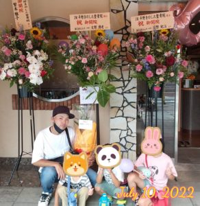 お祝いの観葉植物を担いで子供ちゃん3人と