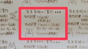 【年末年始のご案内】 公開済み: 2022年12月8日更新: 2022年12月8日作成者: kinoshita-seikotsuカテゴリー: お知らせ, ブログタグ: JR平野, JR平野きのした整骨院, JR平野駅, QRコード, イズミヤ, インスタグラム, 大阪一デカいQRコード, 子連れ整骨院, 平野, 平野区, 平野区整骨院, 年末年始のご案内, 整骨院 【年末年始のご案内】 年内診察:12/30(金)午前診まで 年始診察:1/4(水)~1/6(金)は9時~12時、15時~18時 1/7(土)から通常通りの診察時間です 12/31~1/3はお休みですのでご注意くださいませ🐰 関連記事 20 【臨時休診のお知らせ】 【臨時休診のお知らせ】 妻の出産の為本日は臨時休診いたします。 ご不便ご迷惑をおかけいたします。 なお、個別で問い合わせやご連絡をいただいても返信に時間がかかる場合がございます。 再開につきましては決まり次第、ホームペー […] 公開済み: 2024年10月20日更新: 2024年10月20日作成者: kinoshita-seikotsuカテゴリー: お知らせ, ブログ 開院祝いのスタンド花を開放します! 店前に飾ってある お祝いのスタンド花を 本日開放いたします(^O^)/ 地域によっては 開院や開店祝いのスタンド花を 持っていってもらうと 商売繁盛に繋がり縁起が良いとされ 開店祝いのお花は早く無くなったほうがいい と言 […] 公開済み: 2022年7月10日更新: 2022年7月9日作成者: kinoshita-seikotsuカテゴリー: イベント情報, お知らせ, ブログタグ: JR平野, JR平野きのした整骨院, イズミヤ, 加美中学校, 平野, 平野区, 整骨院, 杭全神社, 株式会社ぶんの, 癒し宿ぶんの 31 【営業のお知らせ】 本日は午前も午後も通常通り開院いたします! ご来院の際はくれぐれも無理せず 気を付けてご来院くださいませ😌 公開済み: 2024年8月31日更新: 2024年8月31日作成者: kinoshita-seikotsuカテゴリー: お知らせ, ブログ