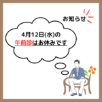 【お知らせ】 明日の4月12日(水)の午前診はお休みです。 午後診は15時から通常通り開院しております! ご迷惑をおかけしますがよろしくお願いいたします🌸 ☆Ins […]