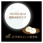 【10月の休診日お知らせ】 10月は通常通り開院しております! 10月16日(月)10:30~絵本読み聞かせイベントです👻 この日はイベントのみです! 整骨院は休診ですのでご注意くださいませ👌 【10月限定 […]