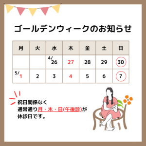 ゴールデンウィークでも祝日関係なく通常通り月・木・日(午後診)が休診です🎏
